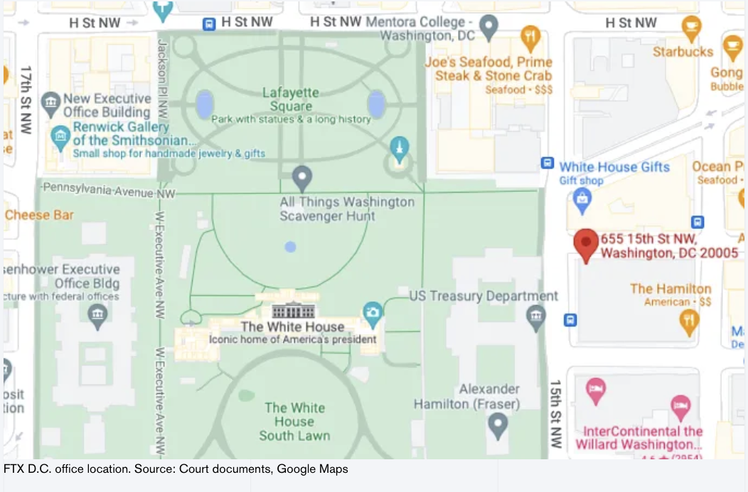 FTX brukade ha ett DC-kontor tvärs över gatan från Vita huset och finansdepartementet, enligt domstolsdokument.