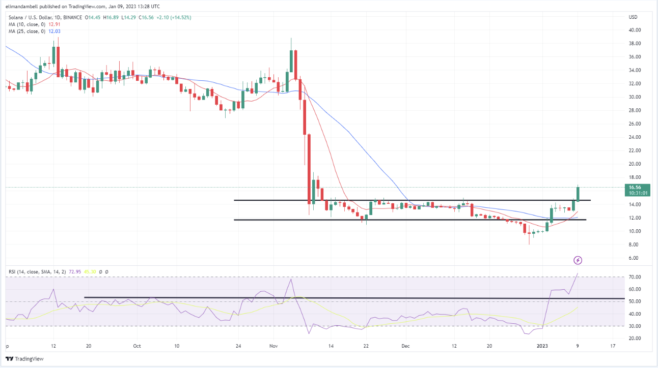 Solana (SOL) var en av måndagens stora vinnare då den steg med så mycket som 22%. SOL/USD steg till ett högsta värde på 16,62 $ vilket kom mindre än 24 timmar efter handeln på den lägsta 13,47 $.