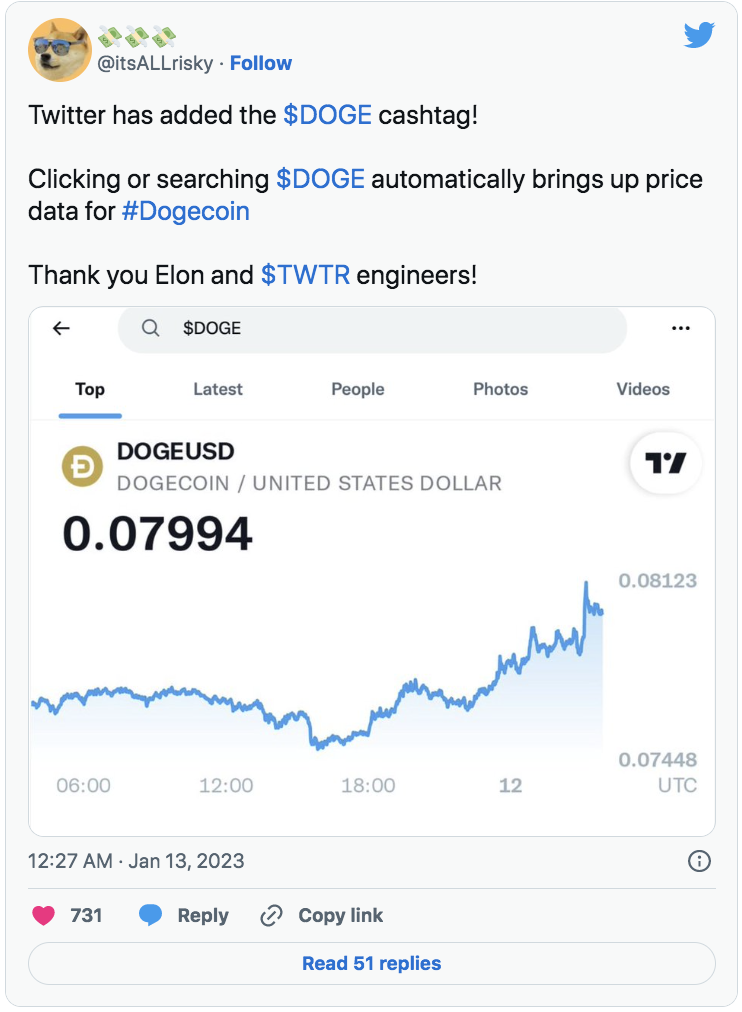 Att twittra eller söka efter en kryptotoken eller tickersymbol med ett dollartecken ($) framför länkar nu till prisdiagram för dessa symboler.