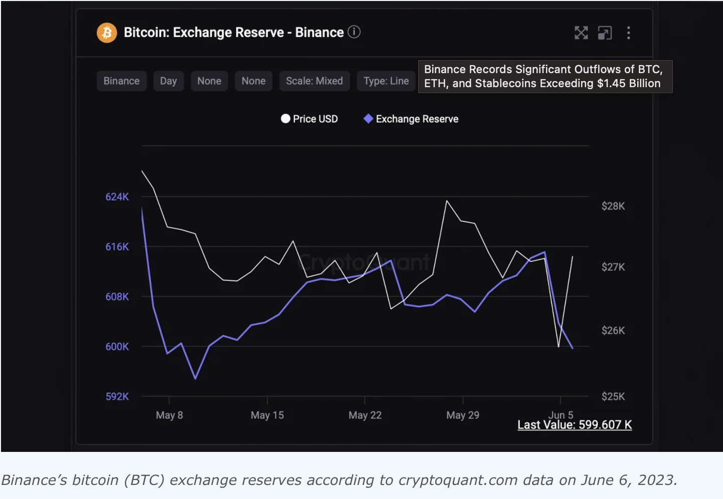 Enligt data från cryptoquant.com har Binance upplevt ett betydande utflöde av BTC, ETH och stablecoins från plattformen. Utflödet började lämna Binance-reserver för ungefär 72 timmar sedan den 3 juni 2023.