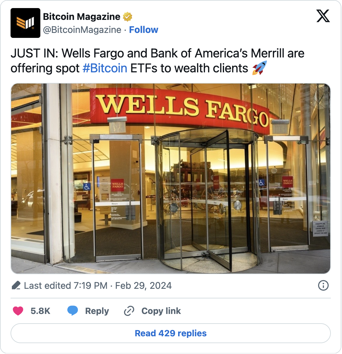 Denna utveckling kommer efter att spot Bitcoin ETF:er hade en rekordvecka i USA, med inflöden av BlackRocks ETF som nådde $612 miljoner i går. Beslutet av Merrill Lynch och Wells Fargo att erbjuda dessa ETF:er visar deras erkännande av den ökande efterfrågan på Bitcoin-investeringsalternativ bland deras rika kundkrets.