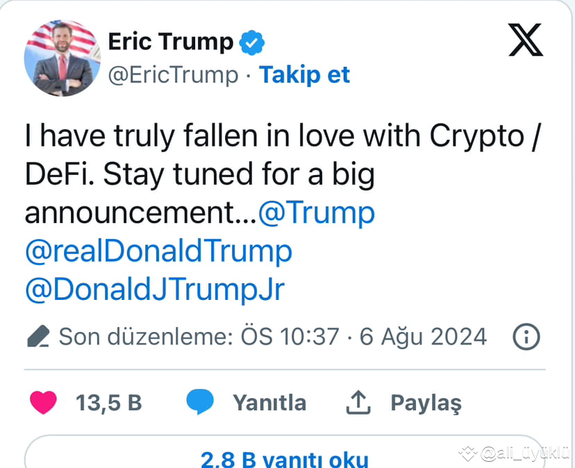 ”Jag har verkligen blivit kär i krypto [och decentraliserad finans (DeFi)],” skrev Eric Trump på X. ”Håll utkik efter ett stort tillkännagivande.”