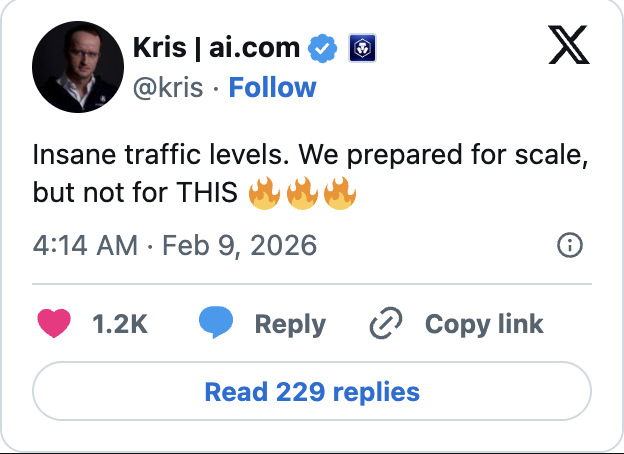 Under fjärde kvarten av Super Bowl 60 sände AI.com, en AI-plattform grundad av Kris Marszalek, medgrundare och VD för Crypto.com, en 30-sekunders reklam som uppmanade tittarna att skapa ett login på webbplatsen.
